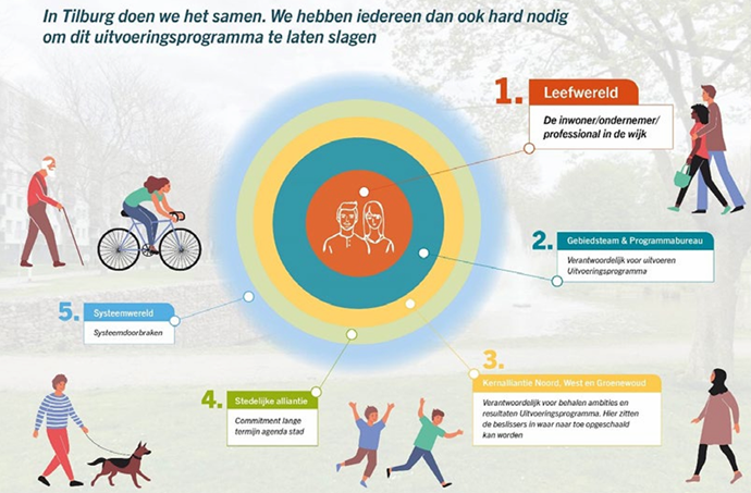 In Tilburg NoordWest werken we volgens een ringenmodel. Dit model laat zien hoe inwoners, professionals, organisaties en bestuurders samen werken aan het NPLV-programma.